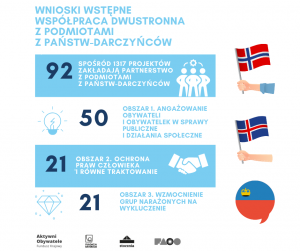 Wśród złożonych wniosków aż 92 zakładają partnerstwa z organizacjami z Państw-Darczyńców (Norwegią, Islandią, Liechtensteinem). A zespół programu Aktywni Obywatele – Fundusz Krajowy pomógł w nawiązaniu 65 partnerstw.