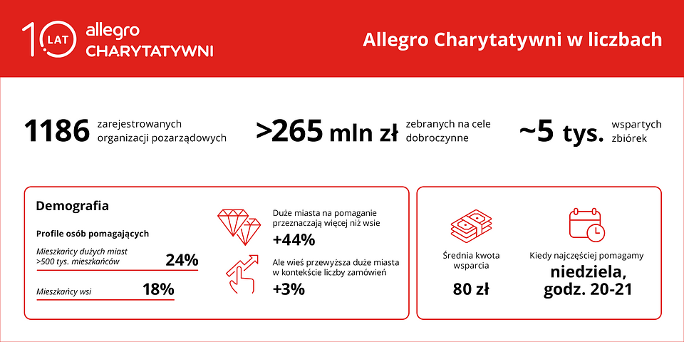 Od 2014 roku Allegro Charytatywni działa na rzecz społeczności, umożliwiając użytkownikom platformy wspieranie szczytnych celów poprzez zakupy, a organizacjom pozarządowym – pozyskiwanie środków. Całość zebranej kwoty trafia bezpośrednio na wskazany cel, bez pobierania opłat czy prowizji od sprzedaży przez Allegro. Akcje, które cieszą się największą popularnością w ramach Allegro Charytatywni to bez wątpienia aukcje na rzecz Wielkiej Orkiestry Świątecznej Pomocy, czy cegiełki charytatywne wspierające Szlachetną Paczkę. Allegro Charytatywni to także narzędzie, które pozwala natychmiastowo reagować w obliczu kryzysów. Było tak w przypadku akcji Cegiełka dla Ukrainy organizowanej razem z Polskim Centrum Pomocy Międzynarodowej i Fundacją Świętego Mikołaja, czy też SOS Powódź organizowanej z Polską Akcją Humanitarną.