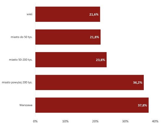 Zależność między wagą motywacji dotyczącej stworzenia ciekawego miejsca pracy a wielkością miejscowości, w której zarejestrowana jest organizacja, jest dokładnie odwrotna. Czynnik związany z chęcią stworzenia ciekawego miejsca pracy jest najczęściej wskazywany przez organizacje z dużych miast, najrzadziej z kolei przez organizacje wiejskie.