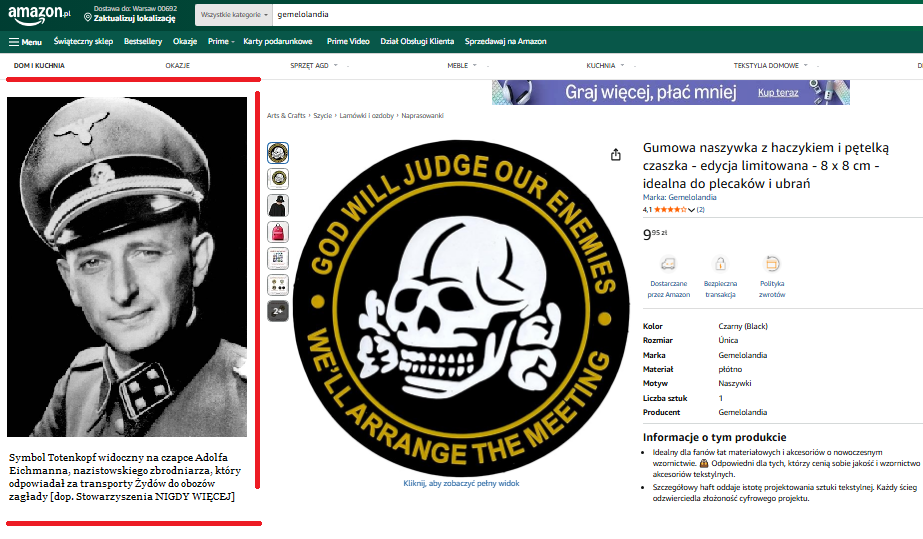 W serwisie Amazon.pl nie brakuje współcześnie wyprodukowanych gadżetów z symboliką nazistowską, np. naszywek z charakterystyczną trupią czaszką, zwaną Totenkopf. Podczas II wojny światowej symbol ten widniał na umundurowaniu członków specjalnych oddziałów SS (SS-Totenkopfverbände), którzy byli wartownikami w obozach koncentracyjnych.