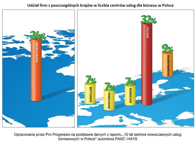 Według danych z w/w raportu największy udział w liczbie centrów usług dla biznesu w Polsce mają firmy z kapitałem rodzimym (32%). Na drugim miejscu, a pierwszym wśród inwestorów zagranicznych, plasują się przedsiębiorstwa amerykańskie (24%). Kolejne pozycje należą do krajów skandynawskich (9% firm), Niemiec, Francji i Wielkiej Brytanii (po 7% firm w sektorze). W kategorii „wielkości zatrudnienia” w sektorze firmy ze Stanów Zjednoczonych przodują, pokonując nawet przedsiębiorstwa polskie. Jest to sygnał pewnej tendencji, która może stanowić wskazówkę dla polskich miast zabiegających o zwiększenie potencjału inwestycyjnego. Znając skłonność inwestorów amerykańskich do lokowania swych centrów w Polsce warto zidentyfikować czynniki, mające wpływ na te decyzje i pod ich kątem budować przewagę nad innymi destynacjami biznesowymi.