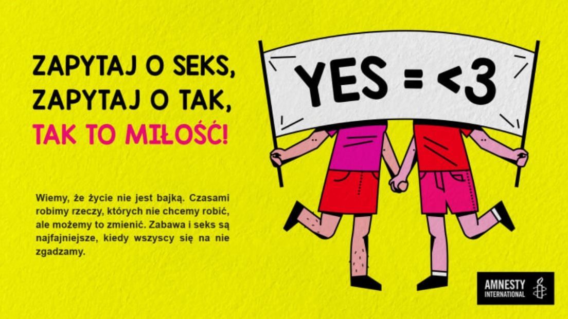 Amnesty International rozpoczyna kampanię „Tak to miłość”, która wzywa do zmiany definicji gwałtu w treści Artykułu 197 kodeksu karnego i uznania za gwałt każdego aktu seksualnego bez zgody drugiej strony, bez względu na to, czy spotkał się on z głośnym i stanowczym oporem. Kampania ma również na celu zmianę świadomości młodych osób, by wiedziały one, że warto rozmawiać o seksie i że pytanie o zgodę powinno być częścią tej rozmowy.