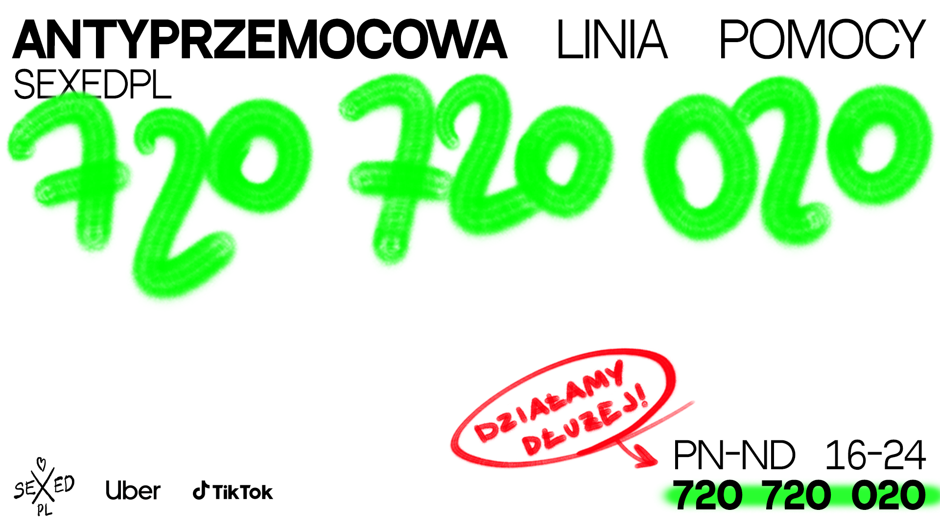 25 listopada z okazji Międzynarodowego Dnia Przeciw Przemocy Wobec Kobiet, Fundacja SEXEDPL startuje z nową kampanią społeczną w ramach akcji „16 Dni Przeciw Przemocy ze Względu na Płeć”. To inicjatywa o globalnym zasięgu, w ramach której Fundacja będzie promować anonimową i bezpłatną Antyprzemocową Linię Pomocy SEXEDPL 720 720 020, a także szerzyć świadomość na temat przemocy wobec kobiet i osób narażonych na dyskryminację ze względu na płeć. Kampania potrwa od 25 listopada do 10 grudnia, czyli do Międzynarodowego Dnia Praw Człowieka.