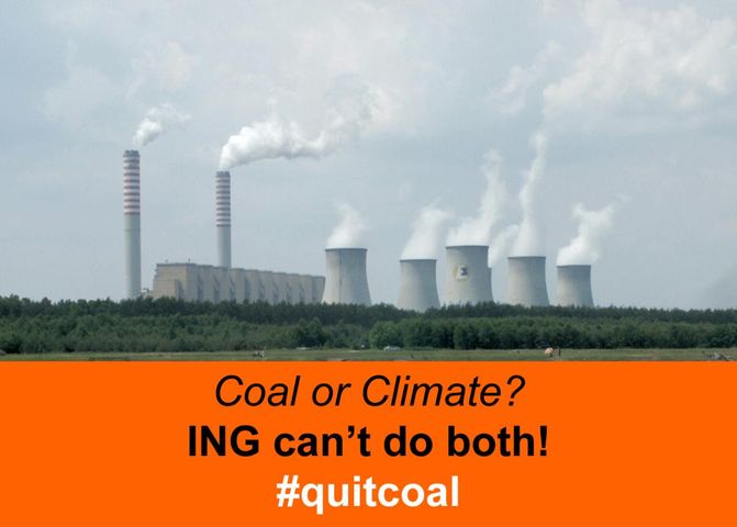 Podczas WZA ING w Amsterdamie przedstawiciele organizacji wzywają ING do uszczelnienia polityki klimatycznej banku poprzez: zakończenie współpracy z dotychczasowymi klientami, których przychody w ponad 50% pochodzą ze sprzedaży węgla lub wytworzonej w efekcie jego spalania energii, określenie terminu obniżenia tego progu z 50% do 30% w przypadku nowych klientów, a także rezygnację z udzielania wsparcia finansowego i usług wszystkim spółkom, które planują budowę nowych lub rozbudowę istniejących mocy opartych na węglu kamiennym lub brunatnym.