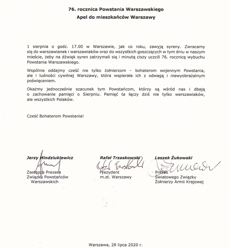 Apel do mieszkańców Warszawy i naszych gości o uczczenie pamięci bohaterów Powstania Warszawskiego podpisał prezydent Rafał Trzaskowski wraz z powstańcami. W tym roku obchody będą miały wyjątkowy charakter z uwagi na pandemię. Mimo to odbędą się wszystkie doroczne wydarzenia, a także dwa specjalne.