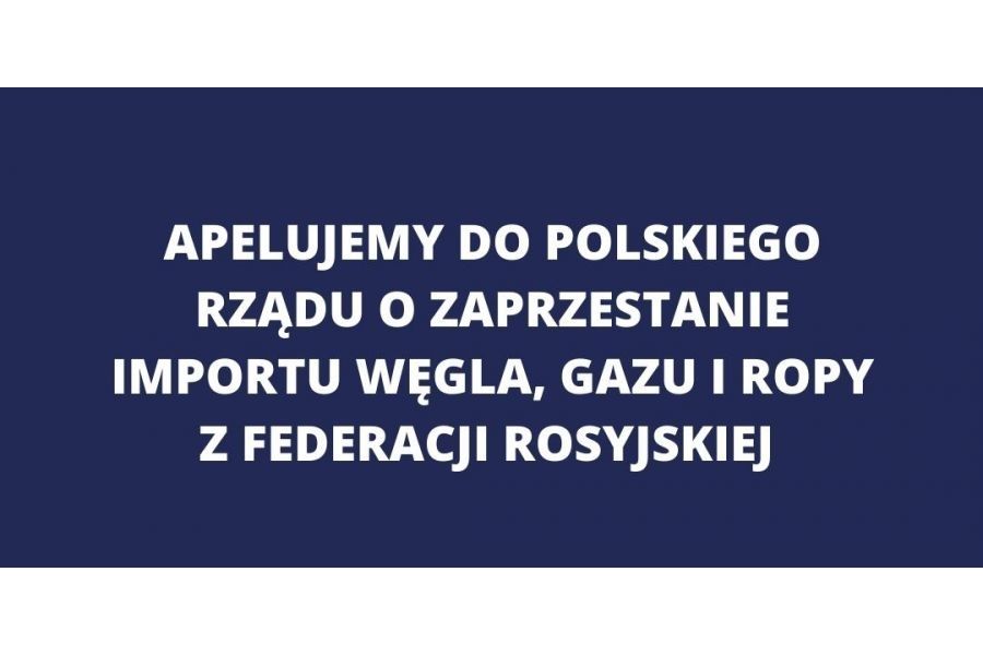 Dlatego apelujemy do polskich władz o zaprzestanie, tak szybko, jak to tylko możliwe i bezpieczne, importu surowców energetycznych: węgla, gazu i ropy naftowej z Rosji. Tylko w 2020 roku Polska zaimportowała ponad 16,5 mln ton rosyjskiej ropy naftowej, niemal 10 mld m3 gazu ziemnego oraz prawie 9,5 mln ton węgla. W ostatnich latach, Polska kupiła od Rosji ropę i węgiel za ponad 730 mld złotych, natomiast wartość kontraktu gazowego na dostawy tego surowca do Polski nie jest jawna. Pieniądze te pośrednio lub bezpośrednio wspierają reżim Władimira Putina.