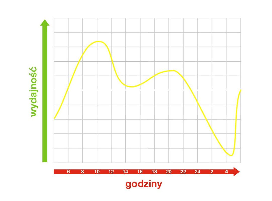 Jak widać pik naszej wydajności przypada na godziny pomiędzy 8 a 12. Właśnie dlatego tak istotne jest, aby dzień rozpoczynać o zadań najbardziej wymagających, odsuwając rozpraszacze na bok. Poranki powinny upływać nam pod znakiem największych wyzwań służbowych danego dnia lub tygodnia. To nie jest dobry czas na zrobienie sobie prasówki, przeglądanie social mediów czy machinalne odpowiadanie na e-maile.