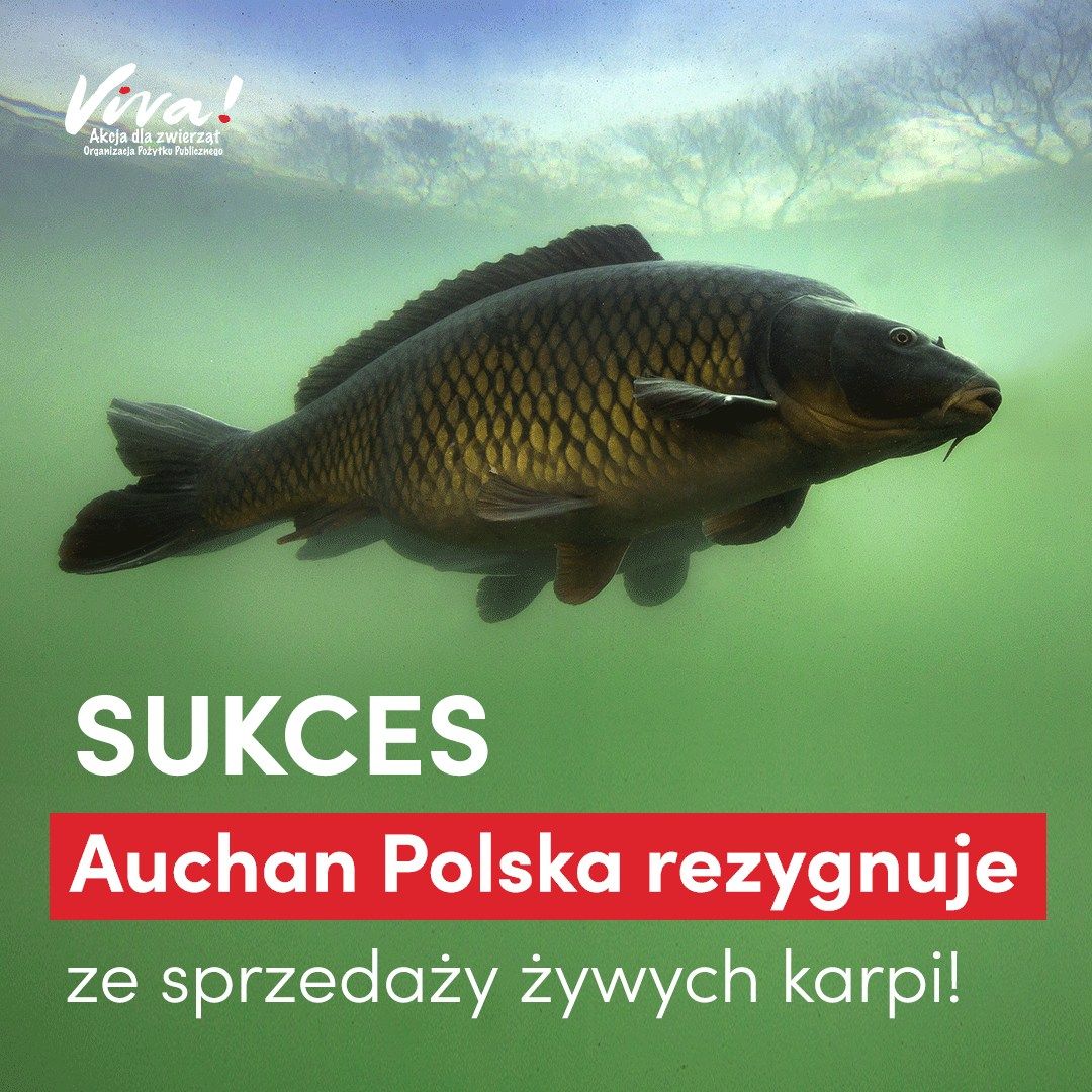 Auchan Polska ostatecznie wycofuje się ze sprzedaży żywych karpi. Od tego roku nie będzie ich w żadnym markecie sieci. To efekt rozmów, jakie z Auchan Polska prowadziła Fundacja Viva! Jedna z największych sieci w Polsce wsłuchała się w głos społeczeństwa, które od lat domaga się zakazu sprzedaży żywych karpi, ze względu na oczywiste cierpienie zwierząt podczas przenoszenia ich w plastikowych siatkach bez wody i utrzymywania w basenach w sklepach.