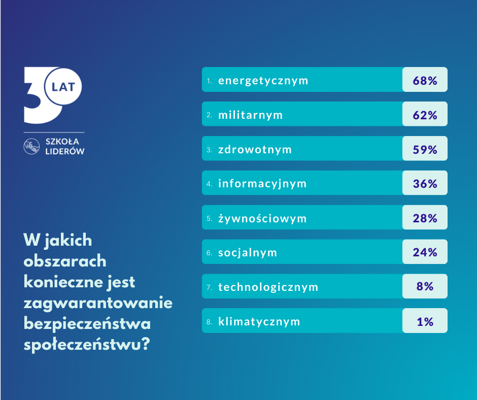 Fundacja zapytała liderów i liderki, który aspekt bezpieczeństwa powinien być najważniejszy w obecnej sytuacji dla osób rządzących. Za najważniejszy rodzaj bezpieczeństwa, który państwo powinno obecnie zapewnić Polakom, zostało uznane bezpieczeństwo energetyczne (68 proc.). Bezpieczeństwo militarne znalazło się na drugim miejscu (62 proc.), a zdrowotne – na trzecim (59 proc.).