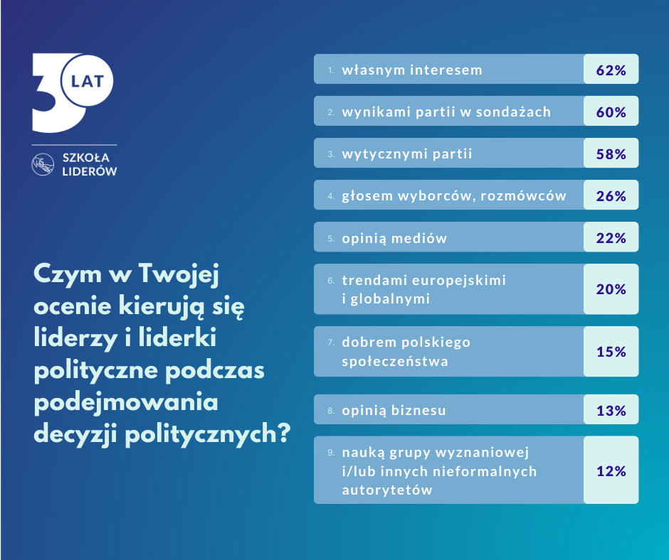 Przyczyną tak miernych ocen mogą być pobudki, którymi kierują się osoby zajmujące się w Polsce polityką. Zdaniem większości absolwentów Fundacji podejmują one decyzje przede wszystkim ze względu na: własny interes (62 proc.), wyniki partii w sondażach (60 proc.) oraz wytyczne partii (58 proc.). W takiej sytuacji trudno o uwzględnienie czynników, takich jak głos wyborców (26 proc.) czy dobro polskiego społeczeństwa (15 proc. wskazań).