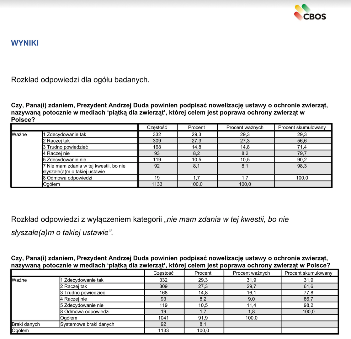 Badanie zostało przeprowadzone między 30 września a 9 października br. na reprezentatywnej grupie 1133 osób, a jego wyniki zostały opublikowane 16 października przez organizacje Otwarte Klatki oraz Viva! Akcja dla Zwierząt. Ankietowani mieli odpowiedzieć na jedno pytanie: „Czy, Pana(i) zdaniem, Prezydent Andrzej Duda powinien podpisać nowelizację ustawy o ochronie zwierząt, nazywaną potocznie w mediach „piątką dla zwierząt”, której celem jest poprawa ochrony zwierząt w Polsce?”.