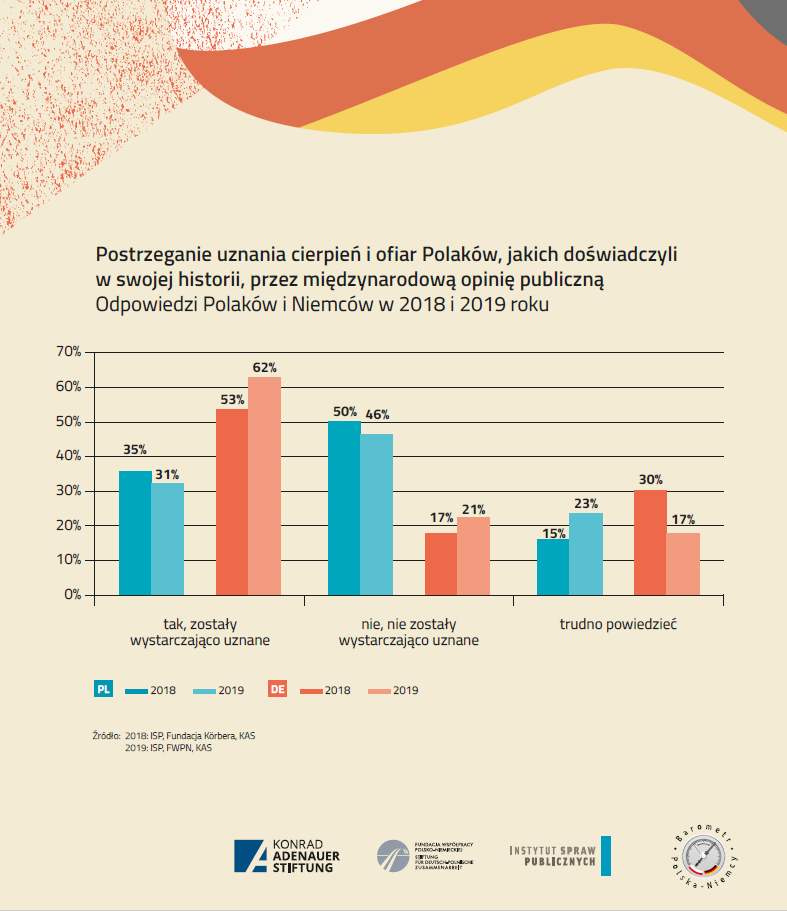 Zdecydowane różnice występują natomiast w opiniach, czy cierpienia i ofiary Polaków, jakich doświadczyli w swojej historii, zostały uznane przez międzynarodową opinię publiczną. Prawie połowa polskich respondentów (46%), uważa, że tak się nie stało, podczas gdy w Niemczech takich opinii jest o połowę mniej (21%). Większość Niemców sądzi, że cierpienia te zostały odpowiednio uznane (62%).