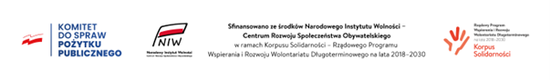 Działania realizowane zgodnie z umową nr 8/KS/L/2022 zawartą z Narodowym Instytutem Wolności dnia 16.09.2022 r. Sfinansowano w ramach konkursu „Lokalne Partnerstwo dla Wolontariatu edycja 2022 - 2024”, ze środków otrzymanych w ramach programu „Korpus Solidarności – Rządowy Program Wspierania i Rozwoju Wolontariatu Długoterminowego na lata 2018–2030”.