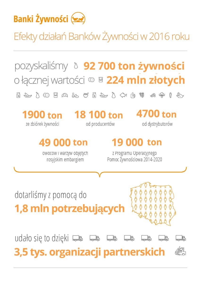 Banki Żywności są jedynymi bankami w Polsce, które nie obracają pieniędzmi tylko żywnością. Ich misją jest ratowanie żywności przed zmarnowaniem oraz wsparcie żywnością najbardziej potrzebujących. Znane są już najnowsze dane dotyczące skali pomocy i działań Banków Żywności w roku 2016. Pozyskano 2 razy więcej żywności od producentów i 3 razy więcej od dystrybutorów.