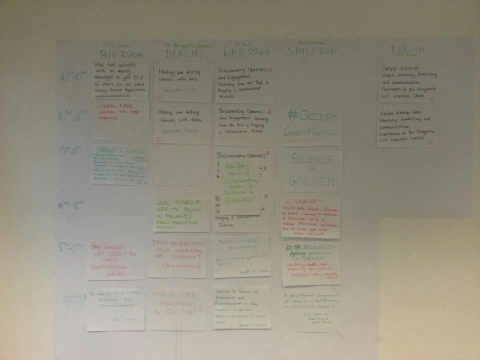 Na wyznaczonym miejscu na ścianie można było przyczepić kartkę z napisanym tematem swojej sesji. W ten sposób uczestnicy stworzyli program całodniowej niekonferencji.