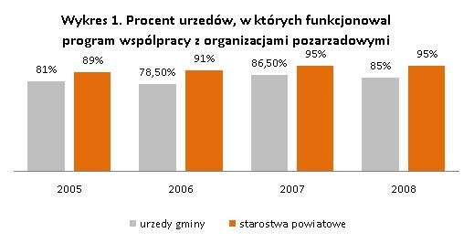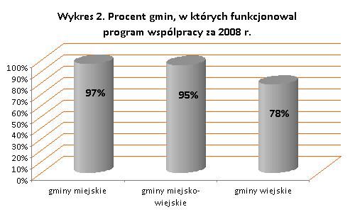 Ustawa o działalności pożytku publicznego i o wolontariacie zobowiązuje samorządy do uchwalenia rocznego programu współpracy z organizacjami pozarządowymi. Mimo że treść ustawy nie pozostawia wątpliwości co do obligatoryjności tego zapisu, w pierwszych latach po jej wejściu w życie wywiązywanie się z tego obowiązku nie było powszechne. Jak wynika z danych zebranych przez MPiPS (z 1873 gmin), do końca 2004 r. programy uchwaliła niewiele ponad połowa z nich. Na szczęście w latach kolejnych odsetek ten zdecydowanie wzrósł. Jak widać na wykresie 1., procent urzędów, które uchwaliły program współpracy, pozostaje od 2005 r. na podobnym poziomie – średnio uchwala go 83% gmin i 92% powiatów. O ile jednak odsetek starostw powiatowych wypełniających ten ustawowy wymóg systematycznie rósł i osiągnął w 2007 i 2008 r. 95%, to wśród urzędów gmin nadal ok. 15% nie ma programu. Są to przede wszystkim gminy wiejskie (patrz wykres 2.).