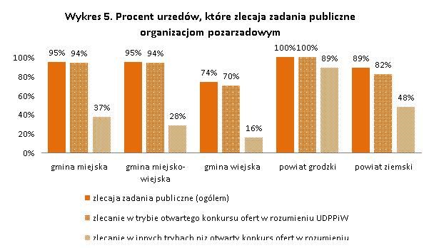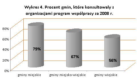 Fakt istnienia w danej gminie czy powiecie programu współpracy nie przesądza o jej intensywności i nic też nie mówi o zasadach, na jakich się ona opiera. Aby zbliżyć się do odpowiedzi na pytania o jakość współpracy, należałoby przeprowadzić dokładniejsze badania. Jednak także na podstawie danych już zebranych można wyciągać wnioski na jej temat. Należy założyć, że lepszej współpracy między urzędami a organizacjami przysłużą się te programy, które były przedmiotem społecznych konsultacji. Nie ma wszak wątpliwości, że tylko wspólne, angażujące obie zainteresowane strony w tworzenie tego dokumentu, daje szansę na prawdziwie partnerską relację na podstawie jego zapisów. Na wykresie 3. widać, że procent gmin i powiatów, które stosują mechanizmy dialogu obywatelskiego, od czterech lat systematycznie rośnie – już 62% urzędów gmin i 83% starostw powiatowych zadeklarowało, że konsultowało z organizacjami program współpracy za 2008 r. Niższy odsetek konsultacji w gminach jest związany z ich rzadszym stosowaniem w gminach wiejskich, co potwierdza wykres 4.