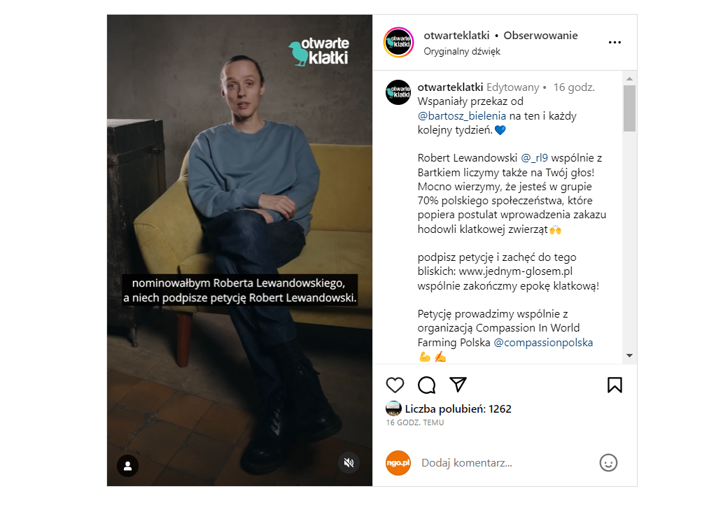 – Zaangażowanie znanych osób, które mają ogromne zasięgi w mediach społecznościowych, jest wartościowe we wszystkich kampaniach społecznych, a w tych dotyczących zwierząt hodowlanych jest szczególnie ważne, bo to wciąż mało popularny temat na tle innych inicjatyw. Liczymy, że Robert, któremu w Otwartych Klatkach na co dzień kibicujemy, podpisze petycję i okaże wsparcie dla inicjatywy, zachęcając do tego kolejne osoby – mówi Weronika Pochylska, Menadżerka ds. Public Relations w Stowarzyszeniu Otwarte Klatki.