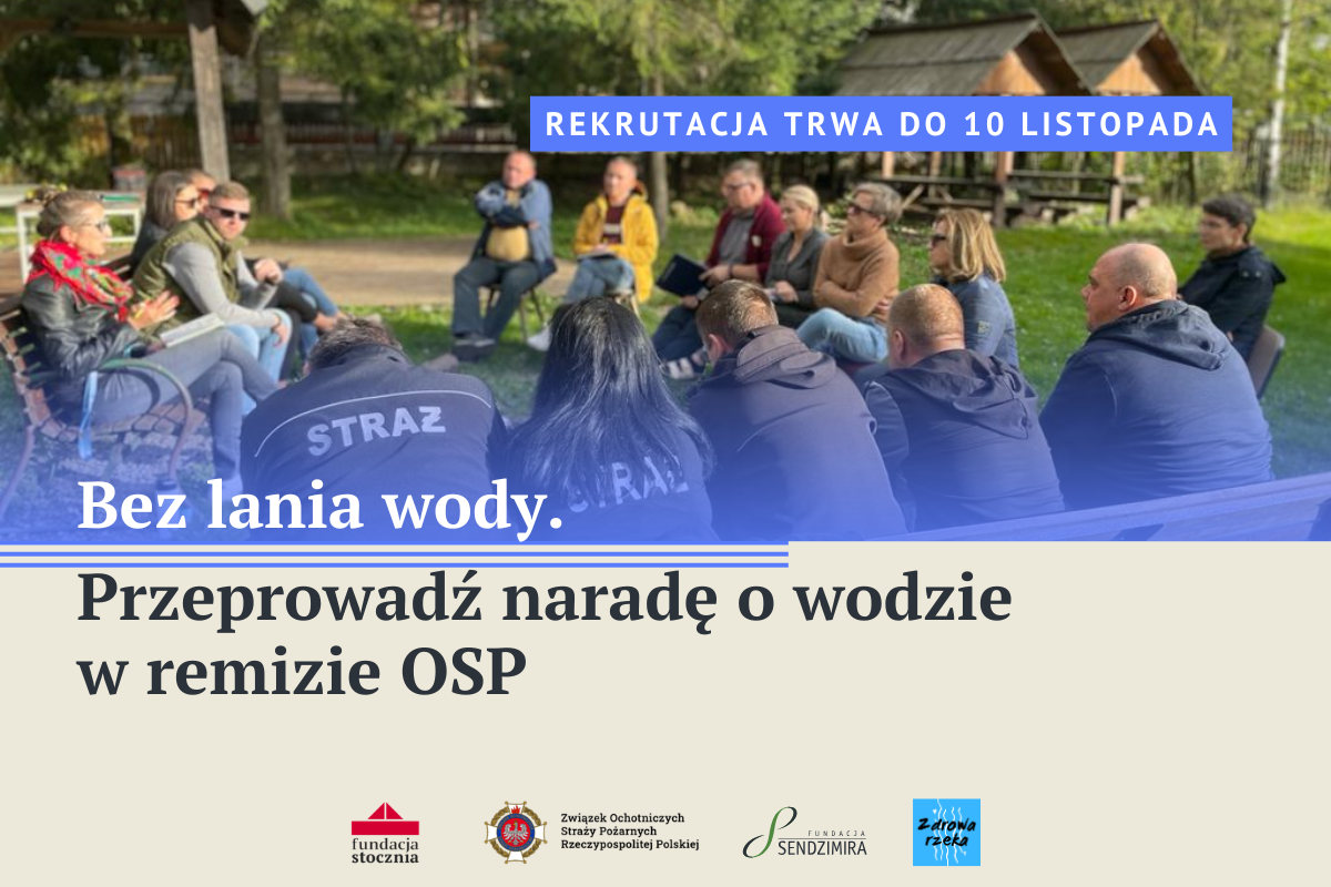 Szkolenie dotyczące wyzwań i rozwiązań związanych z gospodarowaniem wodą, a także organizacji narad odbędzie się 23–24 listopada w Warszawie, a narady o wodzie będą mogły odbyć się do końca stycznia 2025 roku. Każda osoba organizująca naradę w swojej OSP otrzyma 1000 zł (np. na pokrycie kosztów organizacji narady) oraz wsparcie merytoryczne. Zgłoszenia Fundacja Stocznia przyjmuje do 10 listopada poprzez formularz, a szczegółowe informacje o projekcie znajdują się na tej stronie.