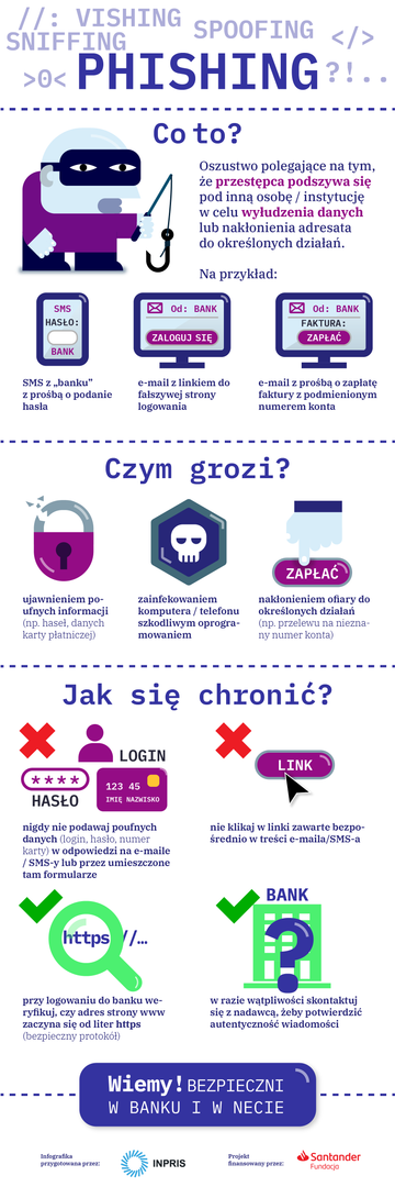 Z infografik w przejrzysty sposób można dowiedzieć się na czym polegają najczęstsze oszustwa (phishing, vishing, spoofing oraz sniffing) i jak się przed nimi chronić. Przedstawiono w infografikach sposób postępowania w przypadku bycia ofiarą takich przestępstw i prawa ofiar. Wskazano też na podstawowe zasady bezpiecznych zakupów w Internecie oraz gdzie szukać pomocy i informacji.