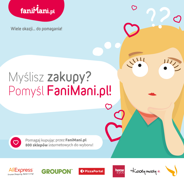 Materiały promocyjne dostępne na FaniMani.pl zachęcają do zakupów i wsparcia przy tej okazji wybranej przez siebie organizacji. Przypominają również o ważnych okazjach zakupowych, takich jak np. zbliżający się Dzień Dziecka. Co ważne, na FaniMani.pl można pobierać gotowe materiały promocyjne z logotypem organizacji. Wystarczy wybrać materiał i organizację, albo po prostu zalogować się na konto administratora organizacji i wejść na stronę z materiałami. Wśród materiałów dostępnych na FaniMani.pl znajdują się min. grafiki na Facebooka, cytaty, plakaty do wydrukowania oraz gotowe wzory maili zachęcających do wsparcia przy okazji zakupów. Można tam znaleźć również wysuwany, interaktywny baner na strony www, który po kliknięciu przekieruje na profil Waszej organizacji na FaniMani.pl.