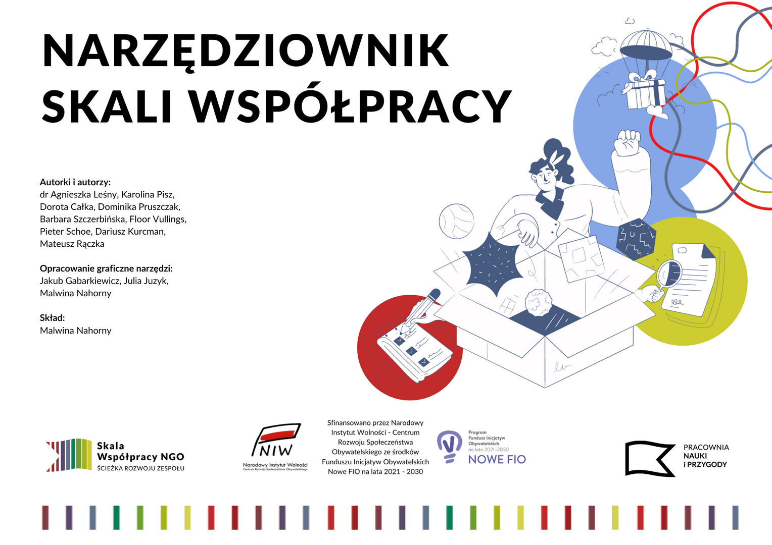 „Narzędziownik” to swoiste kompendium o narzędziach i pomocach metodycznych jakie powstały w ramach projektu „Skala Współpracy NGO”. W jednym miejscu zbiera i opisuje wszystkie narzędzia wraz z linkami do źródeł. Znajduje się w nim opis wszystkich narzędzi, które powstały m.in. puzzli do wykorzystania na spotkaniu z wolontariuszami, plansze i pionki do autorefleksji a nawet ćwiczenia IMPRO inspirowane Skalą Współpracy. Wszystkie narzędzia są bezpłatnie do pobrania TU.