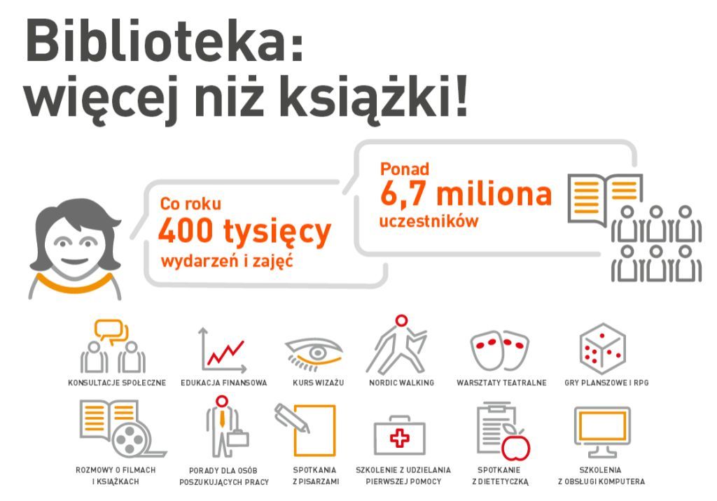Według raportu, w 2012 roku biblioteki publiczne zorganizowały 400 tysięcy zajęć i wydarzeń. Najczęściej były to zajęcia edukacyjne (aż połowa wszystkich spotkań) - np. szkolenia z obsługi komputera, kursy językowe, porady dla poszukujących pracy. Drugie pod względem popularności były zajęcia literackie (1/5 wszystkich bibliotecznych wydarzeń) - np. spotkania z pisarzami czy Dyskusyjne Kluby Książki.