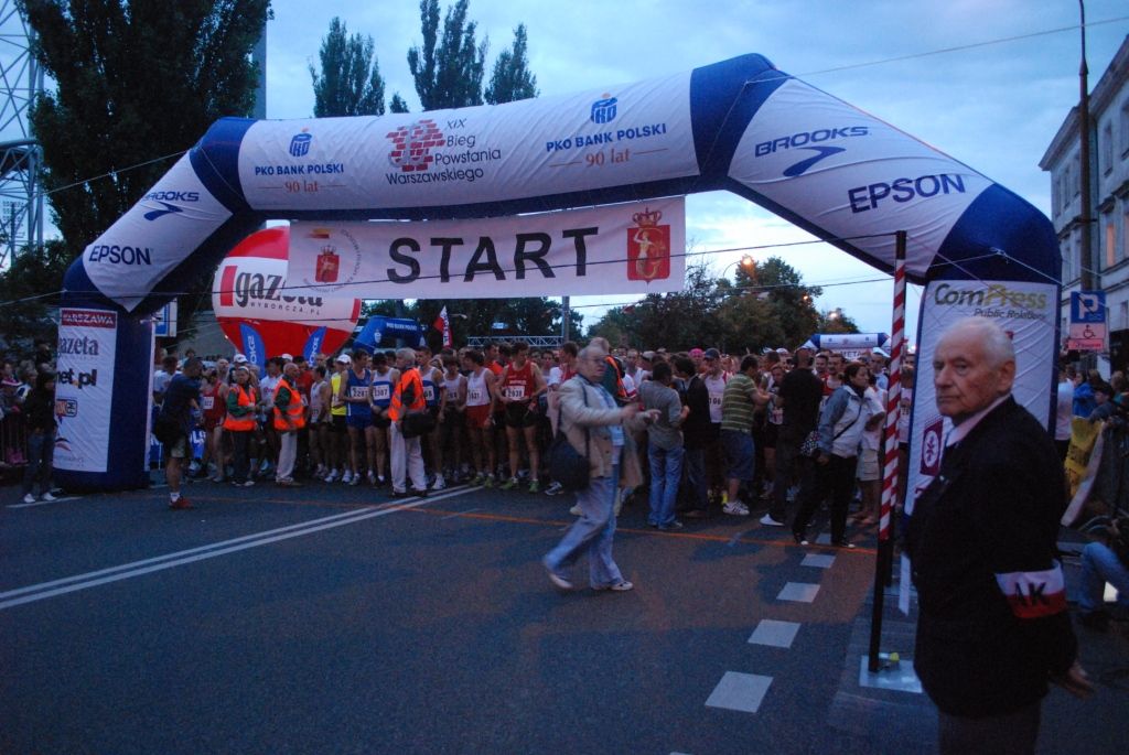 20:45. Czesław Cywiński, Prezes Zarządu Głównego Światowego Związku Żołnierzy Armii Krajowej daje sygnał do startu. Powietrze rozdziera potężny huk. To wystrzał z repliki powstańczego moździerza. 3000 osób wybiega na trasę XIX już Biegu Powstania Warszawskiego. Zawodnicy z biało-czerwonymi opaskami na rękach ruszają Konwiktorską, by po chwili spotkać na Bonifraterskiej młodych powstańców strzelających z karabinów, czających się za latarniami i przystankiem przy budynku Sądu. Ulicę co jakiś czas spowija dym, a na specjalnie ustawionych ekranach widać zdjęcia z sierpnia 44. Na skwerze przy Hotelu Bristol wyrastają barykady powstańcze. Beczki, kozły hiszpańskie, ogromne szpule, drzwi, szafki, walizki i wiadra pojawią się w punktach kontrolnych, a powstańcze patrole wskazują zawodnikom kierunek biegu.