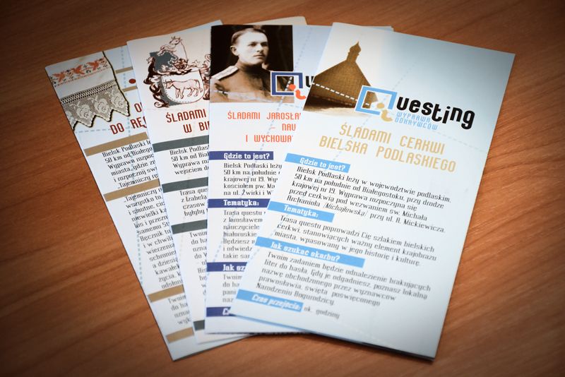 Questy zostały przygotowane przez uczniów bielskich szkół - uczestników projektu „Questing – wyprawa odkrywców” realizowanego przez Fundusz Lokalny na Rzecz Rozwoju Społecznego. O tym, czym jest quest i na czym polega, można było się przekonać podczas promocji drukowanych folderów zawierających trasy turystyczne po Bielsku Podlaskim, która miała miejsce 16 grudnia w bielskim muzeum. Mówiąc w dużym skrócie istotą projektu było odnalezienie przez młodzież interesujących miejsc, postaci historycznych i przedstawienie ich w postaci wierszowanej trasy turystycznej z zagadką i nagrodą. Efektem wielu spotkań oraz warsztatów jest kilka questów, m.in.: Śladami Izabeli Branickiej w Bielsku Podlaskim, Od nasionka do ręcznika ludowego, Śladami Jarosława Kostycewicza – nauczyciela i wychowawcy młodzieży, Śladami cerkwi Bielska Podlaskiego, które już wiosną będzie można otrzymać w Muzeum w Bielsku Podlaskim. Podobne questy istnieją już w innych miastach województwa podlaskiego, tym bardziej cieszymy się, że od nowego sezonu dołączy do nich również Bielsk Podlaski. Nic, tylko zwiedzać! Zapraszamy.