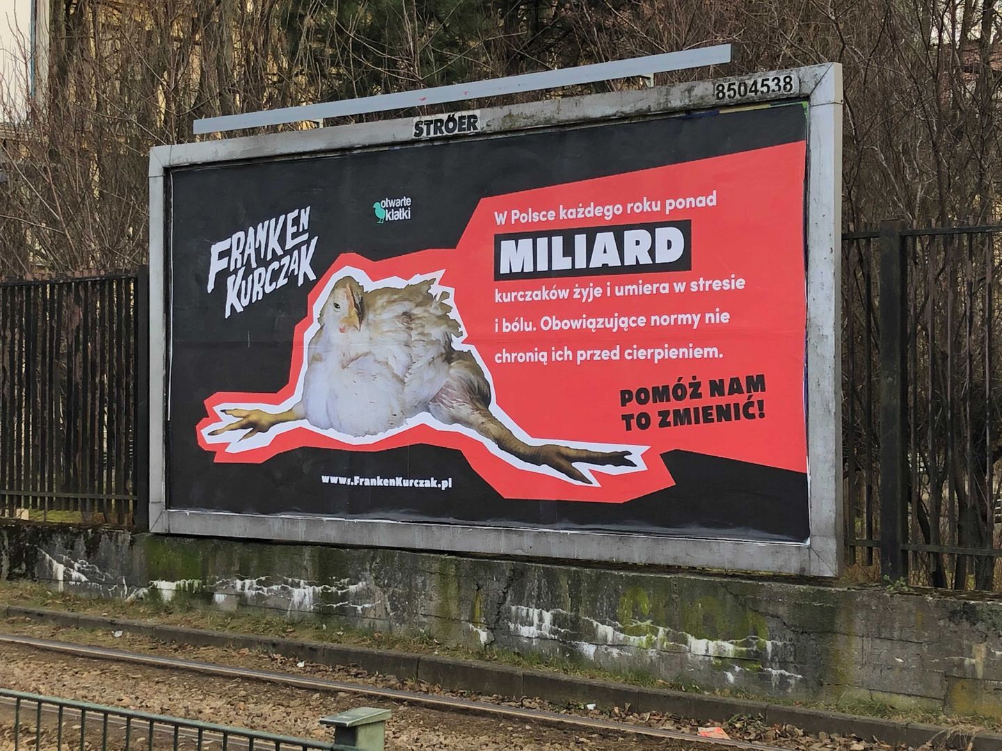 W wybranych miastach w Polsce pojawiły się billboardy przedstawiającego przerośniętego kurczaka, pod którym załamują się nogi – to część ogólnopolskiej kampanii Frankenkurczak, prowadzonej przez Stowarzyszenie Otwarte Klatki, w której aktywiści walczą o lepsze warunki życia kur hodowanych na mięso.