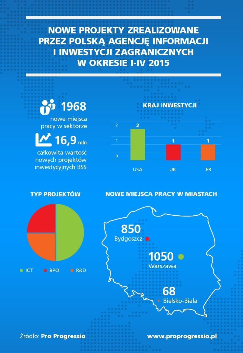 Sektor outsourcingu i nowoczesnych usług dla biznesu nie zwalnia tempa. Według danych Polskiej Agencji Informacji i Inwestycji Zagranicznych (PAIiIZ) pierwsze miesiące 2015 roku to zagraniczne inwestycje o łącznej wartości niemal 17 mln EUR i 1968 nowych miejsc pracy.