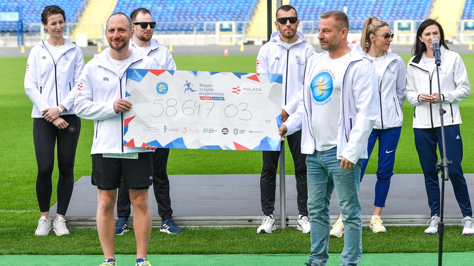 Podczas wielkiego finału akcji „Biegam z czystą przyjemnością” dyrektor Polskiej Agencji Antydopingowej Michał Rynkowski przekazał symboliczny czek na ręce prezesa Stowarzyszenia „Nadzieja na Mundial” Sylwestra Trześniewskiego. To symboliczne przekazanie, bo środki, dokładnie 58 647,03 zł, zostaną podzielone i rozdysponowane tak, aby doposażyć jak największą liczbę domów dziecka w sprzęt sportowy.