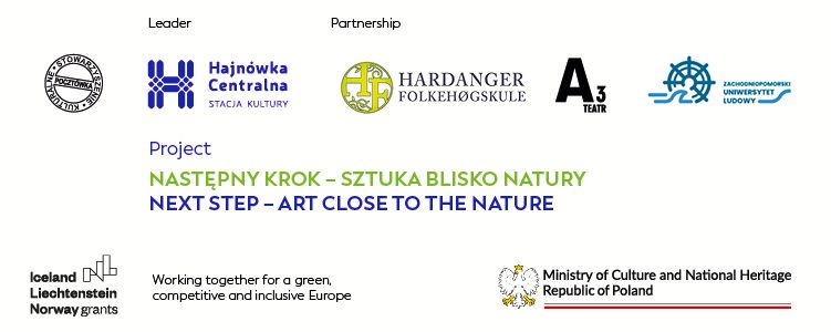 Projekt jest finansowany z Funduszy norweskich oraz Funduszy EOG. Hajnówka Centralna - Stacja Kultury, Hardanger Folkehøgskule z Norwegii oraz Zachodniopomorski Uniwersytet Ludowy to partnerzy nowego polsko-norweskiego projektu Następny Krok -Sztuka Bliżej Natury. Logotypy zaangażówanych instytucji. Projekt jest współfinansowany z .