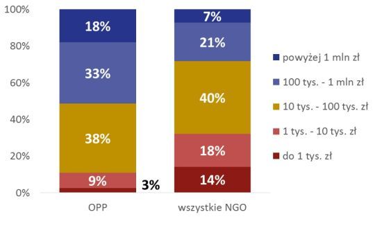 Lepszą kondycję finansową OPP widać przy analizie struktury budżetów stowarzyszeń i fundacji ze statusem OPP oraz wszystkich organizacji pozarządowych. Wśród organizacji pożytku publicznego ponad połowa dysponuje rocznie kwotą nie mniejszą niż 100 tysięcy złotych. Z kolei wśród wszystkich organizacji pozarządowych takie budżety ma 28% organizacji.