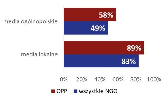 Nie jest zaskakujące, że OPP to również ta część sektora pozarządowego, która ma więcej kontaktów z mediami – tymi ogólnopolskimi, ale także lokalnymi. 58% stowarzyszeń i fundacji mających status OPP twierdzi, że utrzymuje kontakty z ogólnopolskimi mediami takimi jak telewizja, radio, gazety, czasopisma czy portale internetowe. Wśród wszystkich stowarzyszeń i fundacji takie kontakty utrzymuje 49% organizacji. Dużo bardziej powszechne są również kontakty z mediami lokalnymi – 89% OPP utrzymuje relacje z mediami lokalnymi, podczas gdy wśród wszystkich stowarzyszeń i fundacji robi to 83% organizacji.