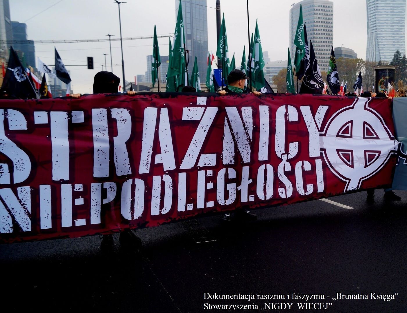 - WARSZAWA. 11 listopada 2023 uczestnicy tzw. Marszu Niepodległości palili flagi Unii Europejskiej. Skandowali też hasła rasistowskie i ksenofobiczne, m.in. ‘Biały honor, biała duma’, ‘Biała siła jest i była’, ‘Polska dla Polaków’, ‘Znajdzie się kij na lewacki ryj’. Eksponowali również flagi z krzyżem celtyckim, flagę w barwach III Rzeszy czy transparent ‘Stop ukrainizacji Polski’.