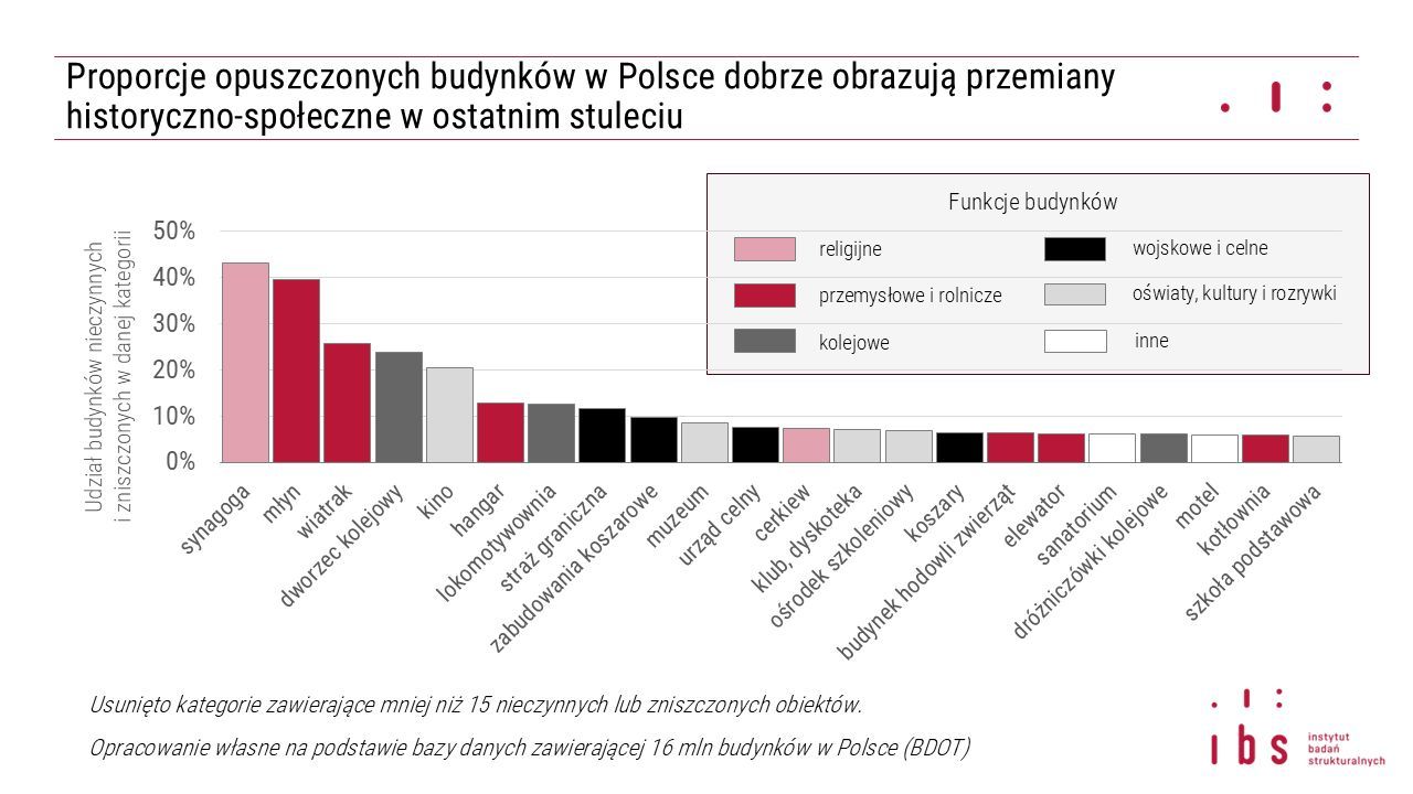 W Polsce mamy niemal 16 milionów budynków. Podstawowe dane o nich możemy czerpać z Bazy Danych Obiektów Topograficznych (BDOT), koordynowanej przez państwowy Geoportal. Baza ta dostarcza między innymi informacji o 160 możliwych funkcjach i czterech etapach życia budynków (czynny, nieczynny, zniszczony, w budowie). Dzięki skrzyżowaniu funkcji i etapów życia możemy precyzyjnie określić, które budynki stoją puste, a następnie zbadać, jakie zmiany społeczno-gospodarcze mogą za tym stać.