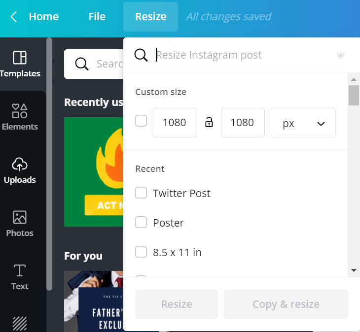 Funkcja zmiany rozmiarów grafik jest bardzo przydatna. Załóżmy, że organizujemy wydarzenie i potrzebujemy grafik w tym samym stylu do zamieszczenia na Facebooku jako post, jako okładka wydarzenia, a także do umieszczenia w newsletterze jako baner. W Canvie zmienimy rozmiar za pomocą kilku kliknięć. Nie musimy też pamiętać wymiarów tych grafik – w Canva zapisana jest większość formatów do mediów społecznościowych. Funkcjonalność ta dostępna jest w wersji PRO.