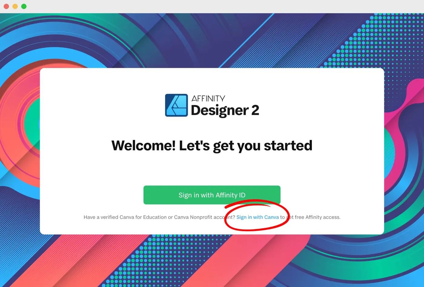 - Zaloguj się za pomocą konta Canva we wszystkich programach: wybierz opcję „Sign in with Canva” (Zaloguj się za pomocą konta Canva). Następnie zatwierdź dostęp do konta i przyznaj niezbędne uprawnienia, by rozpocząć pracę w aplikacji Affinity.