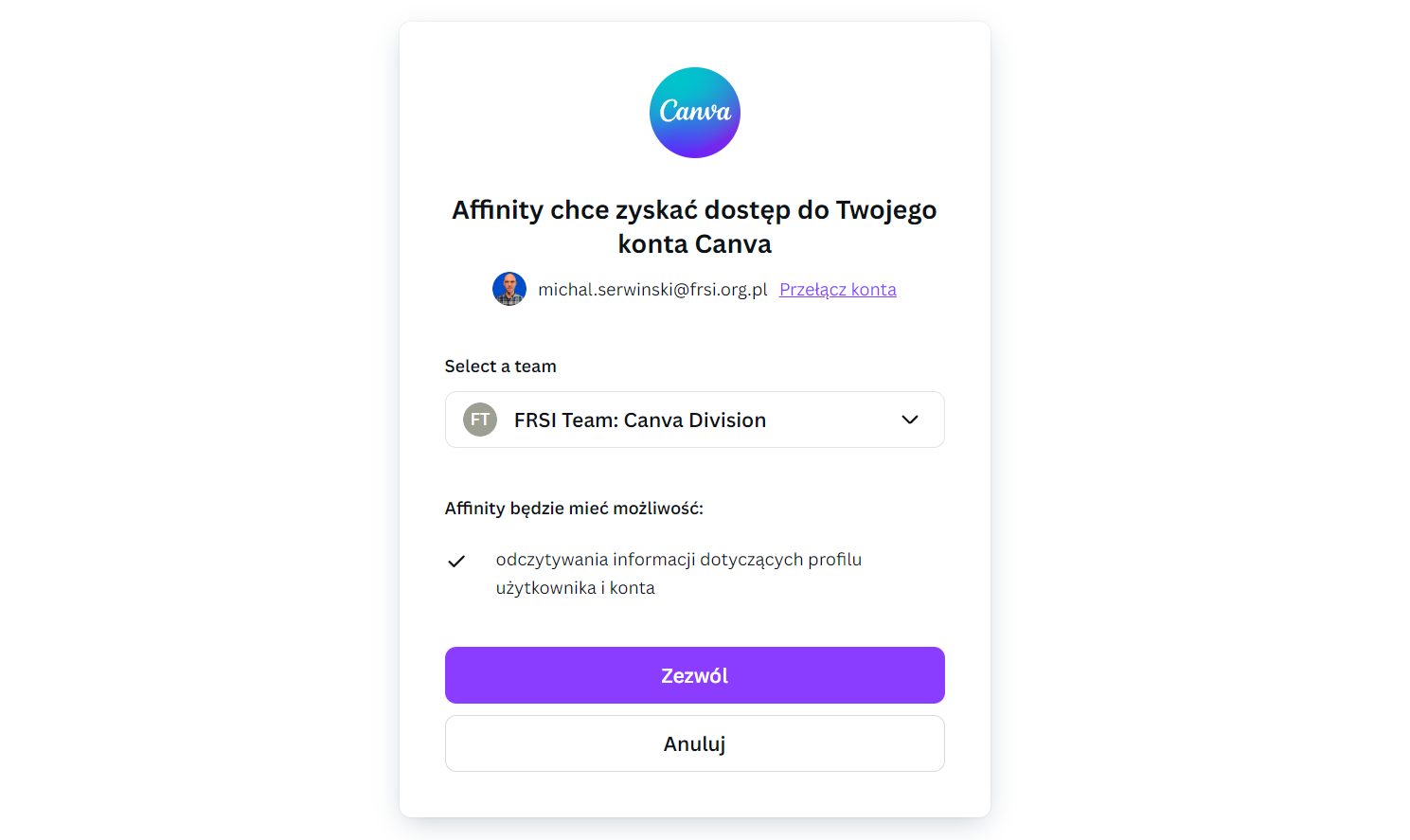 UWAGA: Podczas logowania w przeglądarce internetowej Affinity proprosi o dostęp do konta Canva. Naturalnie, należy takiego dostępu udzielić.