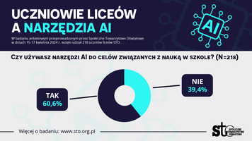Z badania przeprowadzonego przez Społeczne Towarzystwo Oświatowe wynika ponadto, że licealiści korzystają z narzędzi AI przede wszystkim do zdobywania informacji (75,6%), poszukiwania pomysłów (60,0%) i generowania prac, które następnie samodzielnie poprawiają (49,6%).