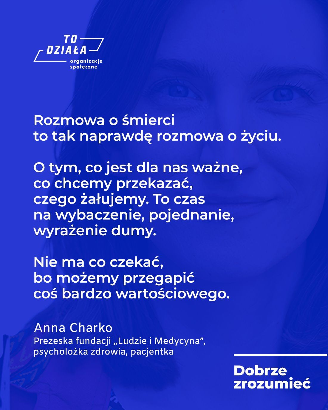 W „Dobrze zrozumieć” mierzymy się z trudnymi tematami, jak rozmowa o śmierci. Anna Charko – prezeska fundacji „Ludzie i Medycyna”, psycholożka zdrowia, pacjentka, opowiada o projekcie „Rozmawianie o śmierci cię nie zabije – karty do rozmów o śmierci”. Z podcastu dowiemy się, dlaczego tak trudno rozmawiać o śmierci z najbliższymi, jak zacząć taką rozmowę, a także jak ważne i uwalniające może być to doświadczenie.