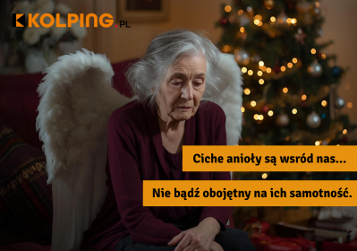Starsza kobieta o siwych włosach siedzi samotnie w ciemnym pokoju, ubrana w bordowy sweter. Na jej plecach widać duże, białe skrzydła anioła. Kobieta patrzy w dół, wygląda na smutną i zamyśloną. Za nią stoi choinka ozdobiona świątecznymi lampkami. Po lewej stronie u góry znajduje się logo „KOLPING.PL”. Po prawej, na dwóch żółtych prostokątach, umieszczono napisy: „Ciche anioły są wśród nas…” oraz „Nie bądź obojętny na ich samotność.”