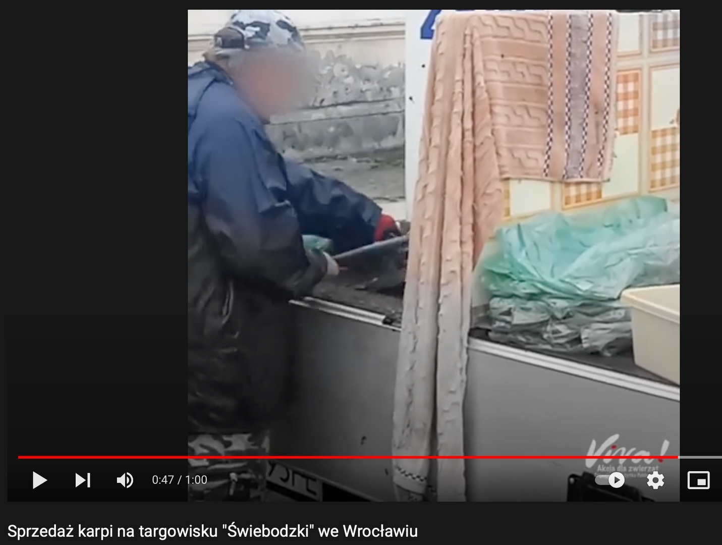 Po wieloletniej kampanii edukacyjnej większość dużych sieci handlowych wycofała ze sprzedaży żywe karpie. Niestety – karpie na targowiskach wciąż są sprzedawane w nieprawidłowy sposób. Na targu „Świebodzki” we Wrocławiu aktywiści zarejestrowali pakowanie ryb do reklamówek bez wody, ogłuszanie na oczach przechodniów, ryby stłoczone w nienatlenionych zbiornikach z brudną wodą oraz karpia miotającego się po chodniku.