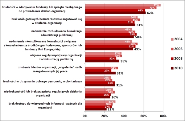 W badaniu z 2010 roku organizacje najczęściej wskazywały trudności w zdobywaniu funduszy lub sprzętu niezbędnego do prowadzenia działań. Odczuwa je 62% organizacji. Choć jest to wynik podobny, jak dwa lata wcześniej, to w porównaniu z latami poprzednimi obserwujemy znaczący spadek wagi tego problemu: w 2006 r. jako „bardzo odczuwalny” lub „raczej odczuwalny” wskazało go 71%, a w 2004 r. aż 76% organizacji. Tak znaczących zmian nie widać już w przypadku pozostałych trzech najczęściej wskazywanych problemów: braku osób gotowych do zaangażowania się w działania organizacji, nadmiernie rozbudowanej biurokracji administracji publicznej oraz skomplikowanych formalności przy aplikowaniu o fundusze. Każdy z nich wskazywany był jako „zdecydowanie” lub „raczej odczuwalny” przez około połowę organizacji, i nie widać w tym zakresie dużych zmian od 2004 r.