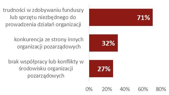 Organizacje zdrowotne w porównaniu do całego sektora pozarządowego są też krytyczne w odniesieniu do kwestii związanych z trzecim sektorem jako środowiskiem. To właśnie stowarzyszenia i fundacje specjalizujące się w ochronie zdrowia, częściej niż inne NGO, narzekają na konkurencję ze strony innych organizacji pozarządowych (32%) oraz brak współpracy lub konflikty w środowisku sektora pozarządowego (27%).