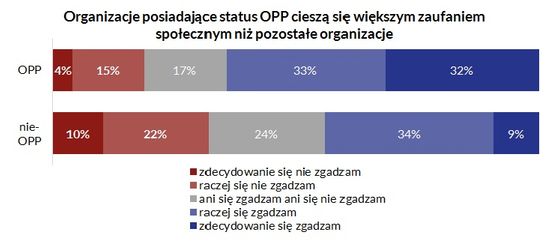 Ze stwierdzeniem „Organizacje posiadające status OPP cieszą się większym zaufaniem społecznym niż pozostałe organizacje” zgadza się 53% (25% jest przeciwnego zdania). Widać jednak różnice między OPP i organizacjami, które nie mają statusu pożytku publicznego – te pierwsze podpisałyby się pod ww. opinią w 65%, przy czym połowa ma w tej sprawie zdecydowane zdanie, za to „pozostałe organizacje” podzielają opinię o większym zaufaniu do OPP w 43%.