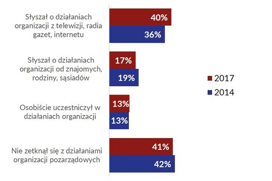 Ciągle niewielu Polaków ma kontakt z organizacjami. Podobnie jak w 2014 roku, 13% deklaruje, że w ciągu ostatnich 12 miesięcy osobiście uczestniczyło w działaniach organizacji, np. brało udział w organizowanych przez nie imprezach, wydarzeniach, zbiórkach, korzystało z ich usług. 17% słyszało o organizacjach od sąsiadów. Najczęściej Polacy stykają się z organizacjami za pośrednictwem mediów – 40% kojarzy je z telewizji, radia gazet, Internetu (o 4 punkty procentowe więcej niż w 2014 roku). 41% dorosłych mieszkańców Polski w ostatnim roku nie miało styczności z organizacjami, a przynajmniej nie jest tego świadome.