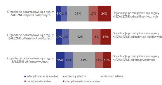 Także w kwestii relacji z instytucjami publicznymi dominują opinie, że organizacje są od nich niezależne (uważa tak 35%, a odwrotnego zdania jest 23%).