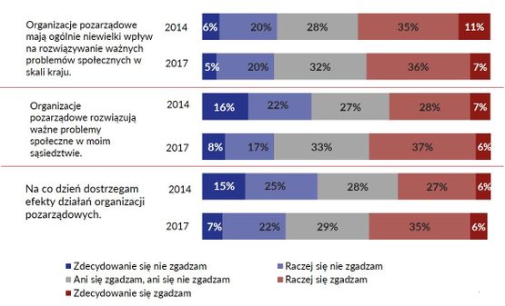 Jednocześnie 43% (niemal tyle samo, co trzy lata wcześniej) badanych zgadza się ze stwierdzeniem „organizacje pozarządowe mają ogólnie niewielki wpływ na rozwiązywanie ważnych problemów społecznych w skali kraju” (odwrotnego zdania jest 25%).